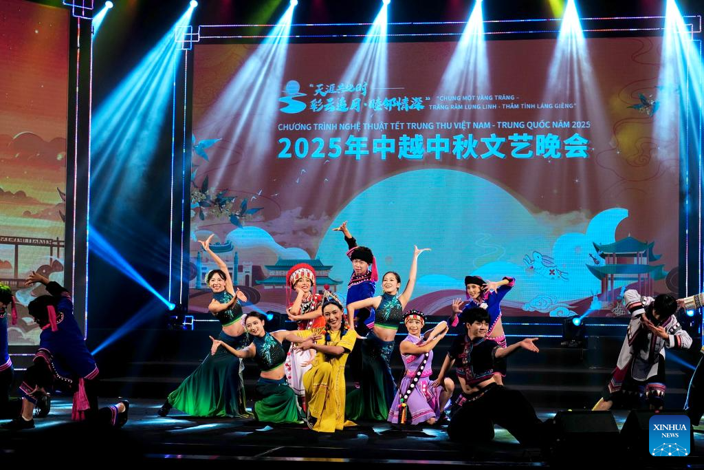 This photo taken on Sept. 25, 2025 shows a scene of a China-Vietnam Mid-Autumn Festival Gala in Hanoi, Vietnam. The gala was held on Thursday in the Vietnamese capital Hanoi, bringing together artists and performing troupes from the two nations on the same stage to celebrate the approaching festival. (Xinhua/Liu Ying)