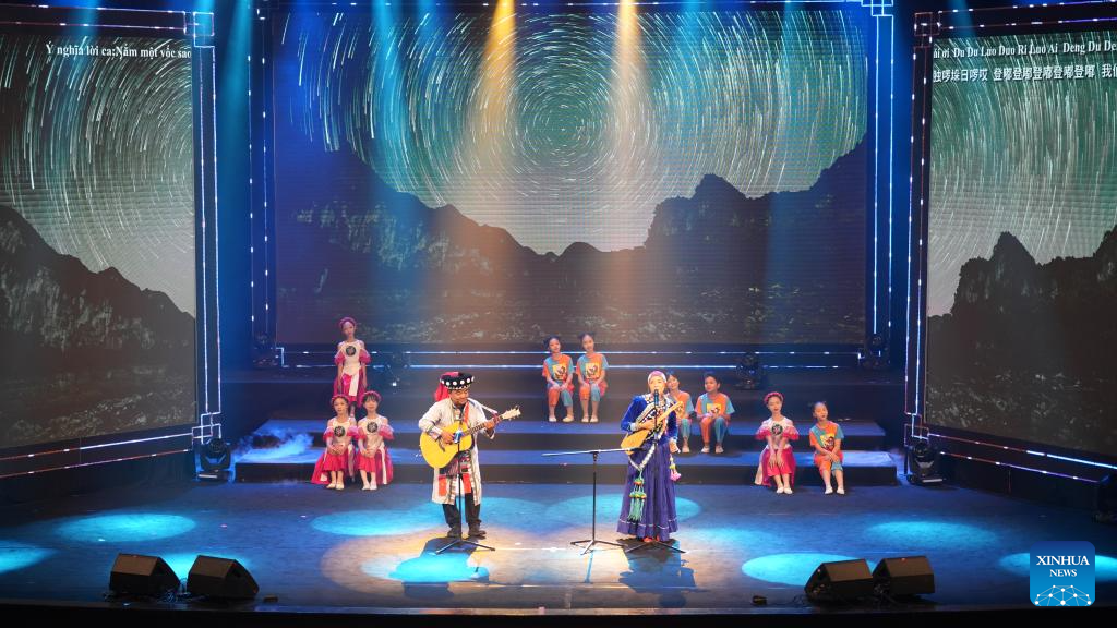 A choir from southwest China's Yunnan Province stages a performance during a China-Vietnam Mid-Autumn Festival Gala in Hanoi, Vietnam, Sept. 25, 2025. The gala was held on Thursday in the Vietnamese capital Hanoi, bringing together artists and performing troupes from the two nations on the same stage to celebrate the approaching festival. (Xinhua/Hu Jiali)