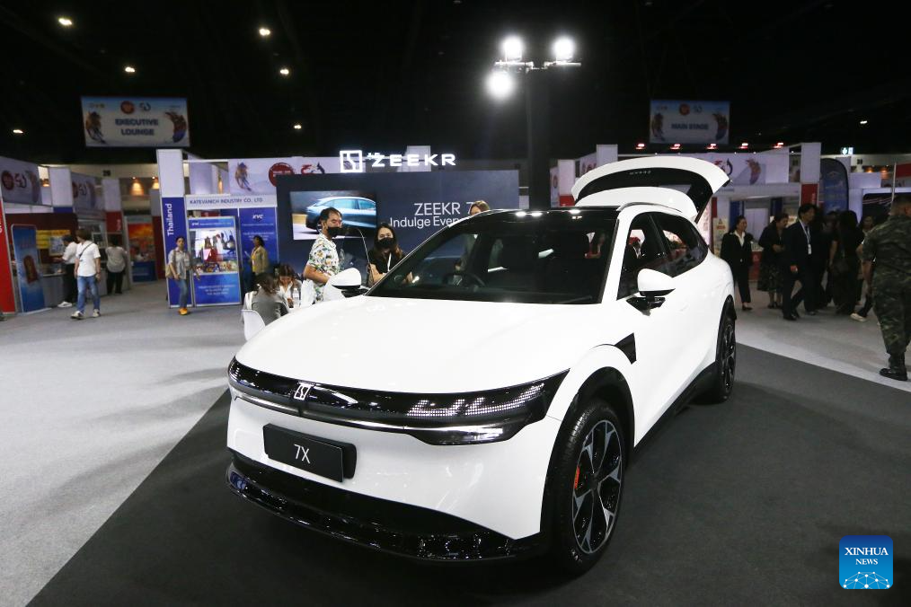 People visit the booth of Chinese new energy vehicle maker Zeekr during the Thailand-China Cooperation Expo 2025 in Bangkok, Thailand, Sept. 26, 2025. The expo commenced here on Friday to celebrate the 50th anniversary of diplomatic ties between Thailand and China, highlighting extensive joint efforts in trade, investment, education, and employment.(Photo by Rachen Sageamsak/Xinhua)