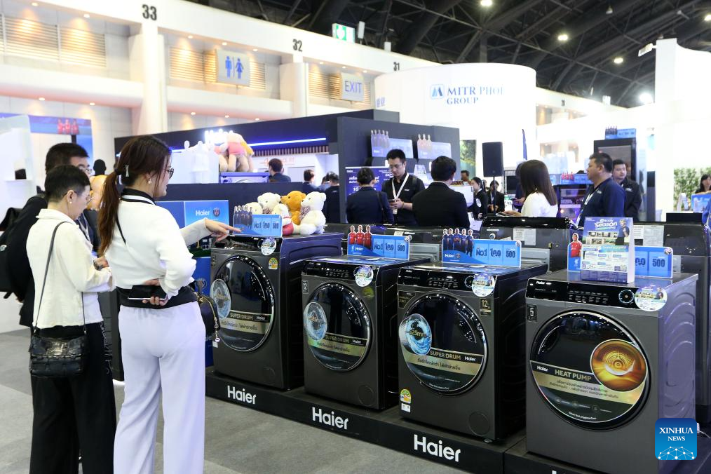 People visit the booth of Chinese home appliance maker Haier during the Thailand-China Cooperation Expo 2025 in Bangkok, Thailand, Sept. 26, 2025. The expo commenced here on Friday to celebrate the 50th anniversary of diplomatic ties between Thailand and China, highlighting extensive joint efforts in trade, investment, education, and employment.(Photo by Rachen Sageamsak/Xinhua)