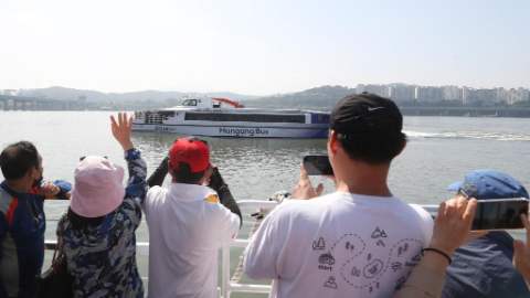 Tourists enjoy scenery of Seoul on "Hangang Bus"