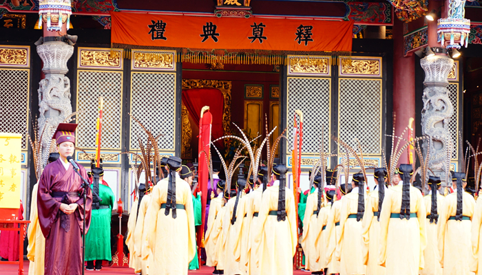 28日清晨,天剛蒙蒙亮,臺(tái)北孔廟大門內(nèi)人頭攢動(dòng),大成殿內(nèi)燈火通明,臺(tái)北各界人士和民眾數(shù)百人在此共同紀(jì)念孔子誕辰2576周年。